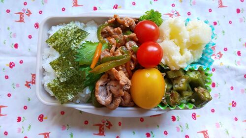 本日もテスト期間にて、お弁当不要。 お弁当箱に詰めると洗うのが面倒なので 「お弁当のおかずをお皿に盛りつける」という方法でいきます。 ・メイン…豚肉と小松菜をウスターソースで味付け ・副菜2種…ナスときゅうりの浅漬け、オクラのめんつゆ和え ・卵焼…