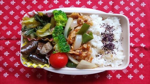 本日のメインは、豚肉と野菜の甘酢あん。 片栗粉がどばっと入ったのでダマになっております…。 副菜は昨日の残りのチンゲンサイのポン酢和えと、 夕食の残りのナスの味噌炒め。 副菜カップの下に卵焼きが隠れていて、 ブロッコリーとミニトマトで副菜と主菜…
